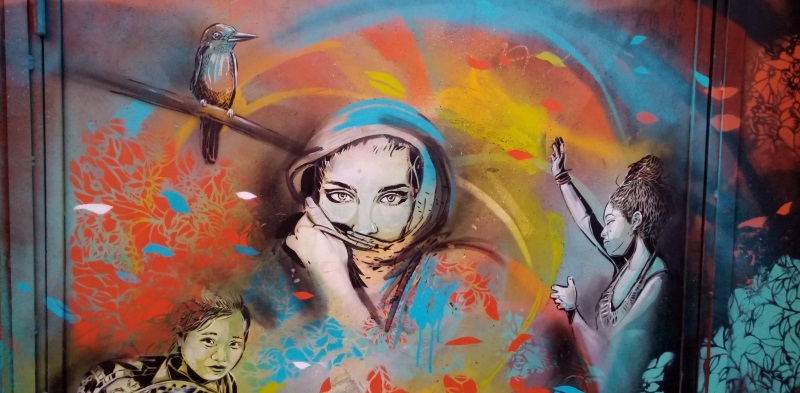 "Refugees welcome," is the title for this gaffiti on a wall in the alley at the Baobab refugee center in Rome. |